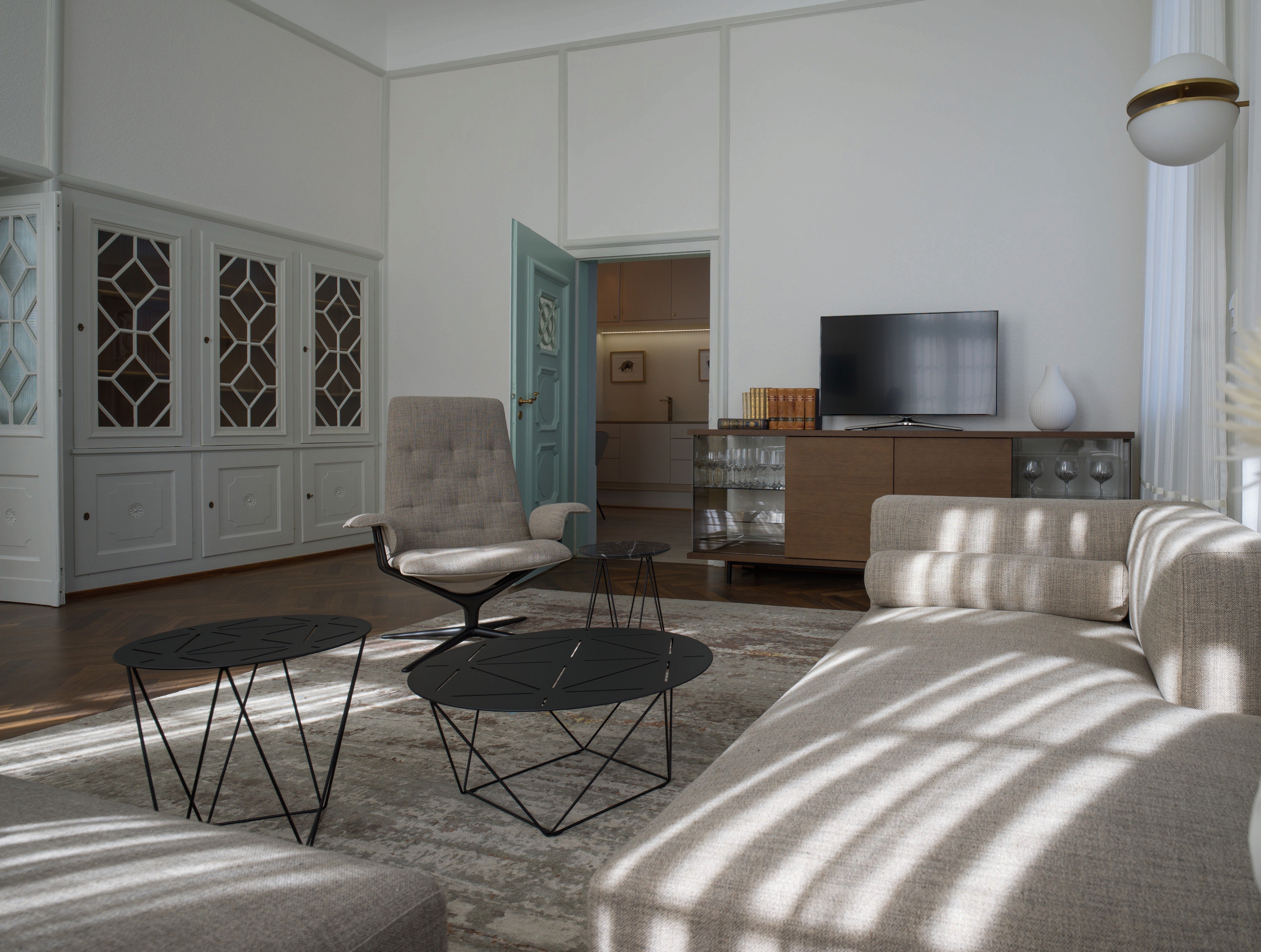 The chairs from this timeless Walter K. series also adorn the opulent foyer with its striking spiral staircase at the heart of this historic building, now enjoying a new lease of life.